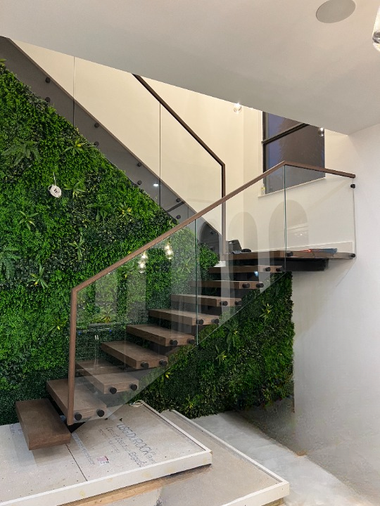 A sleek, contemporary floating staircase featuring rich wooden treads, clear glass panels, and a bold black steel frame. This design maximizes light flow and creates an open, luxurious feel—perfect for modern interiors.